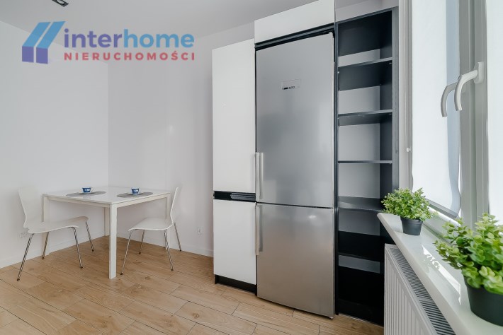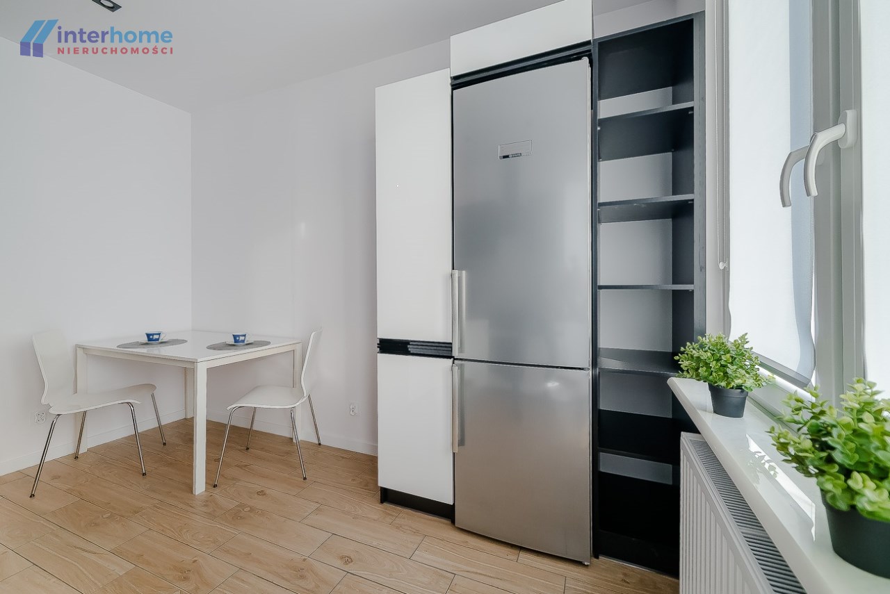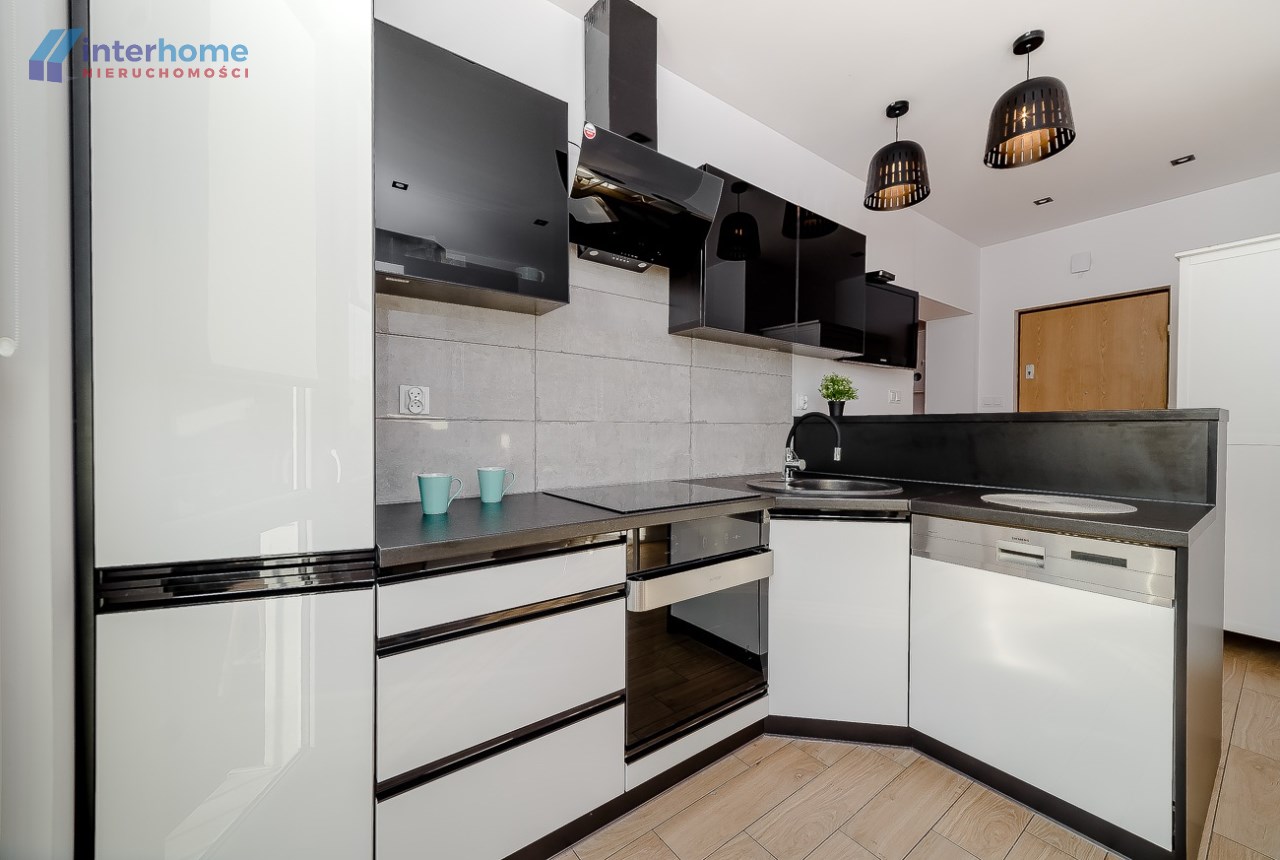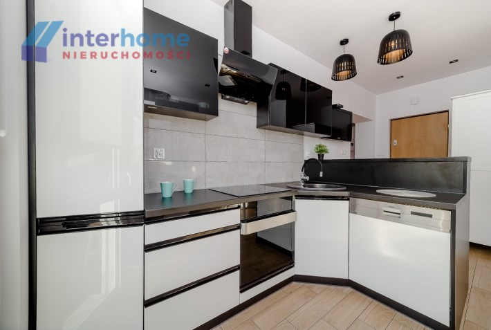 Kuchnia otwarta zabudowana nowymi meblami wyposażona w lodówkę, piec z piekarnikiem, zmywarka, zlewozmywak, urządzona w nowoczesnym stylu