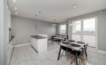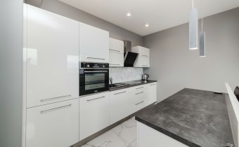 Kuchnia zabudowana meblami wyposażona w lodówkę, płytę indukcyjną, piekarnik, zlewozmywak, zmywarkę.