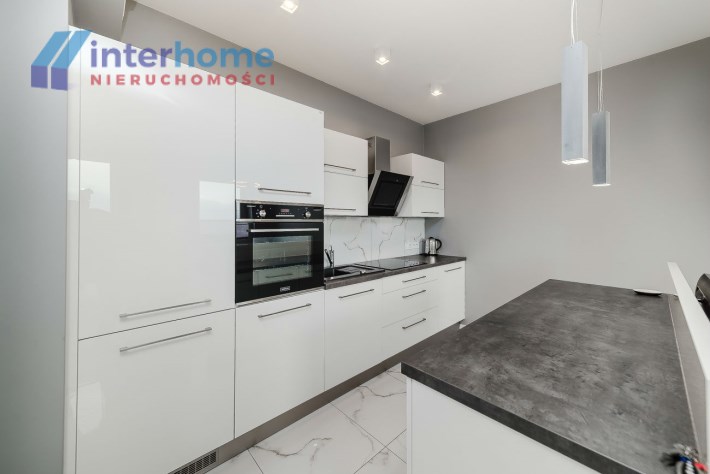 Kuchnia zabudowana meblami wyposażona w lodówkę, płytę indukcyjną, piekarnik, zlewozmywak, zmywarkę.